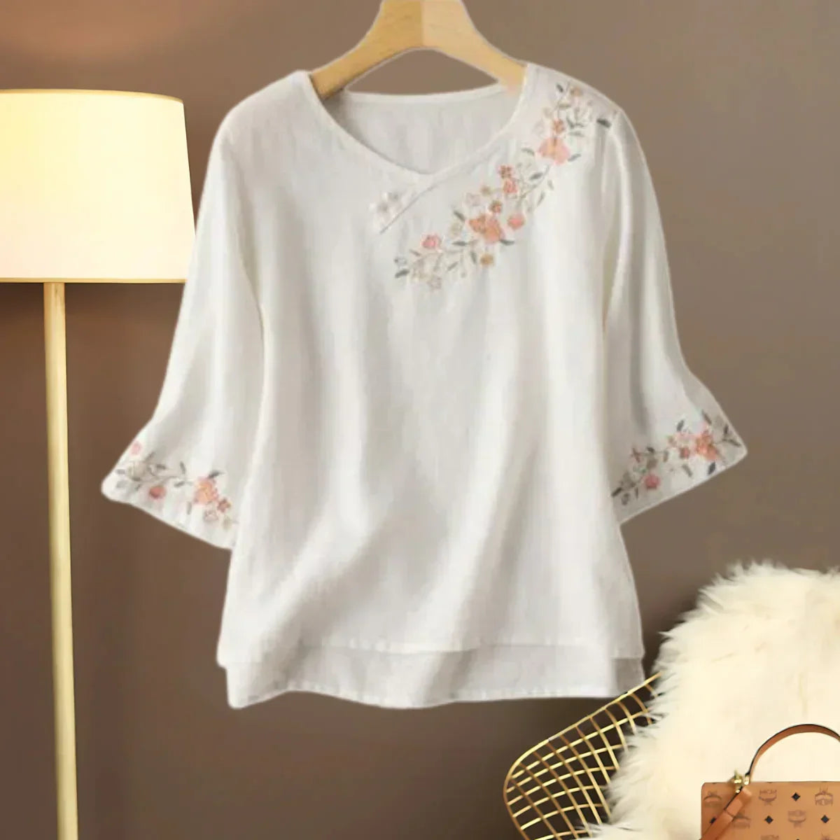 Avec sa coupe délicate et ses broderies florales raffinées, la blouse Léana incarne la douceur et la féminité à l’état pur. Son col asymétrique orné de petits boutons apporte une touche originale subtile, tandis que les manches 3/4 et la finition légèrement ample assurent confort et élégance naturelle.