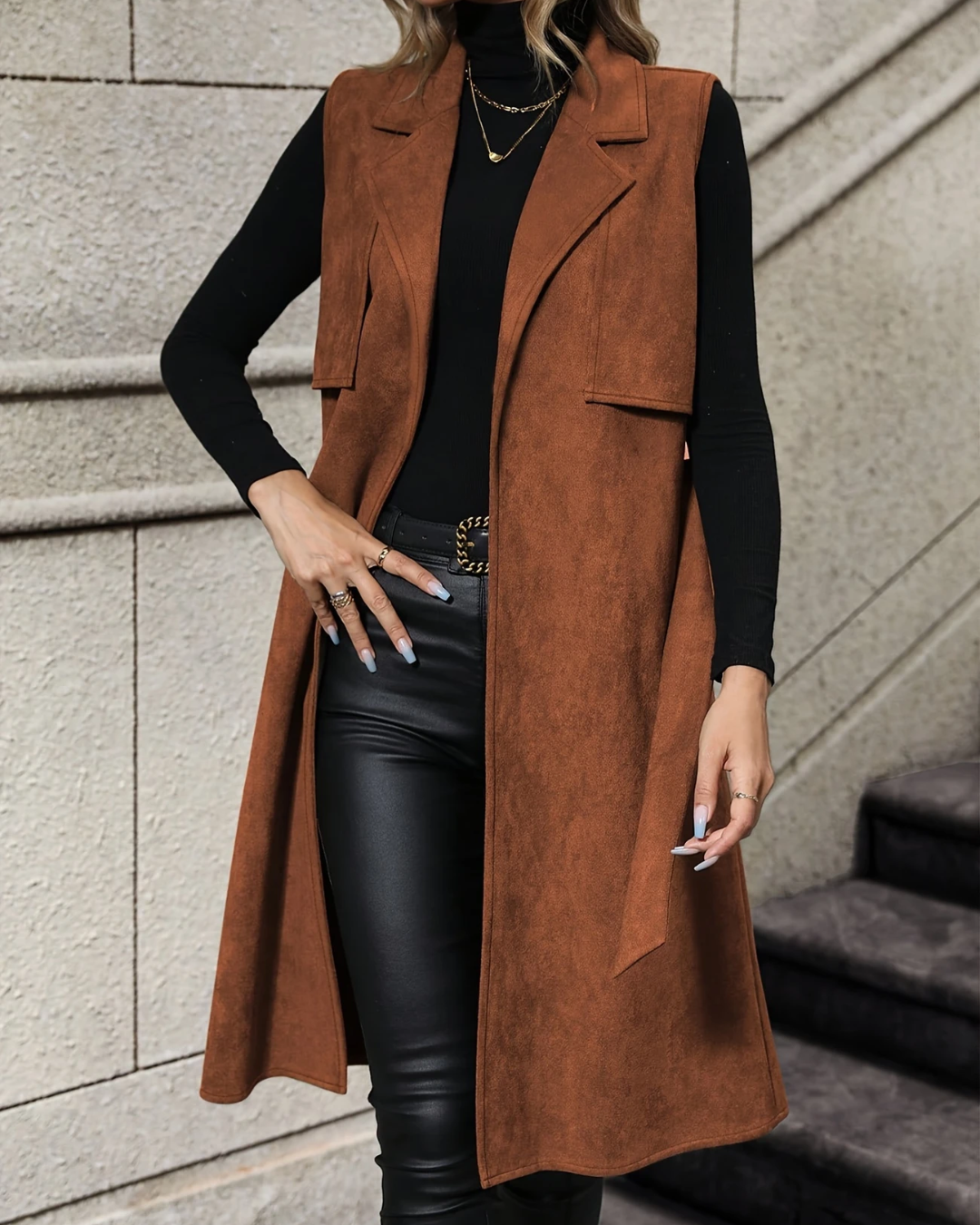 Un gilet long et structuré qui conjugue caractère et élégance naturelle. Avec son col à revers raffiné et sa coupe fluide sans manches, le modèle Énora apporte une touche sophistiquée à vos tenues automnales. Idéal pour superposer sur un col roulé ou une blouse légère.