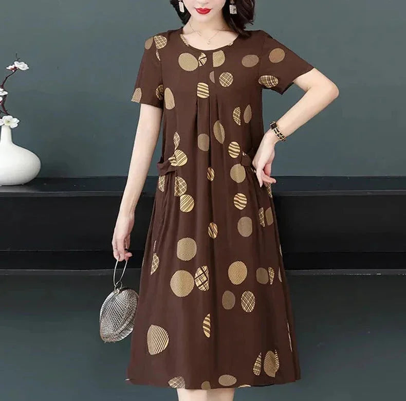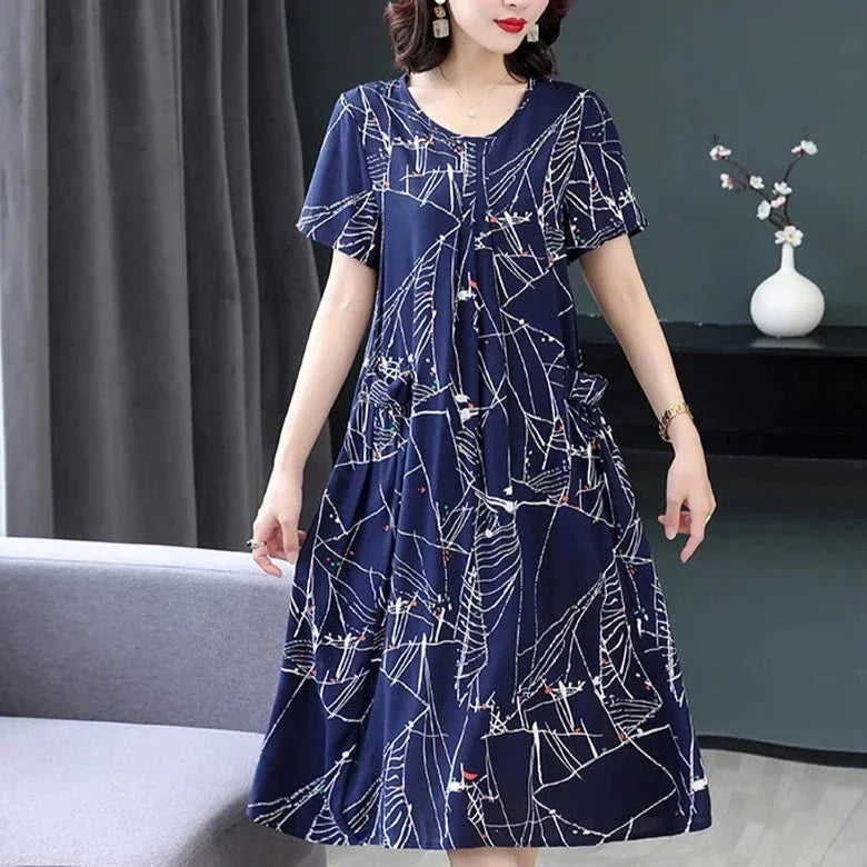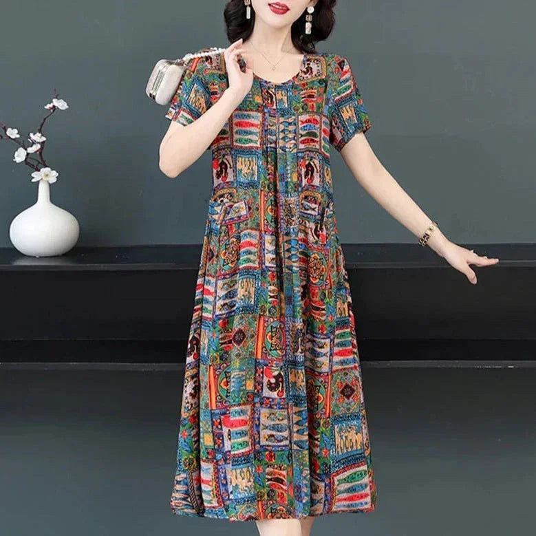 La robe Sylviane incarne un équilibre parfait entre praticité et style. Avec ses poches latérales discrètes et son imprimé graphique sur fond vert profond, elle apporte une touche artistique à votre garde-robe quotidienne. Sa coupe ample et ses manches courtes en font une pièce agréable à porter tout au long de la journée, que ce soit en intérieur ou pour une promenade en ville.