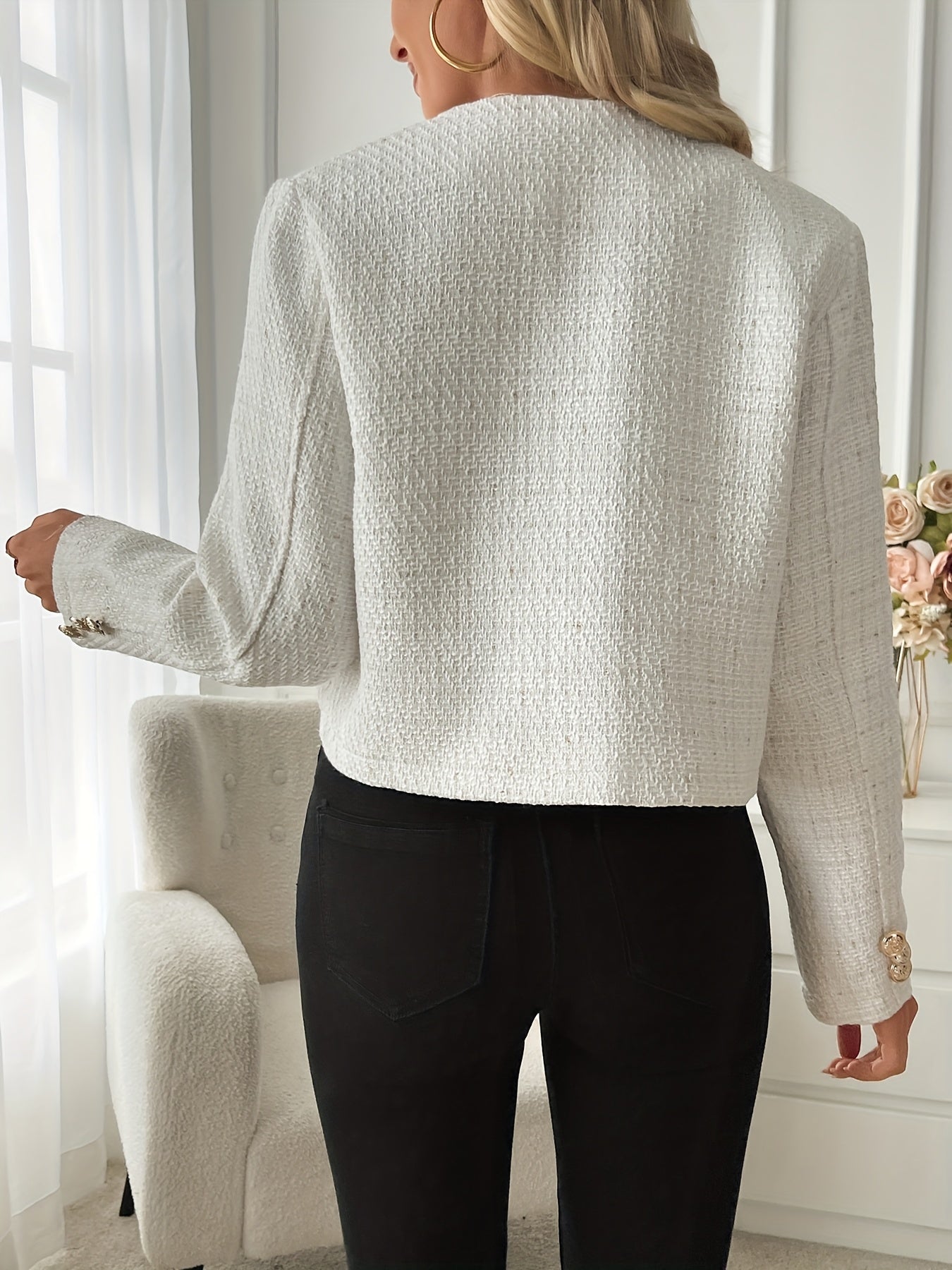 - Coupe courte et ajustée pour une silhouette féminine et structurée.